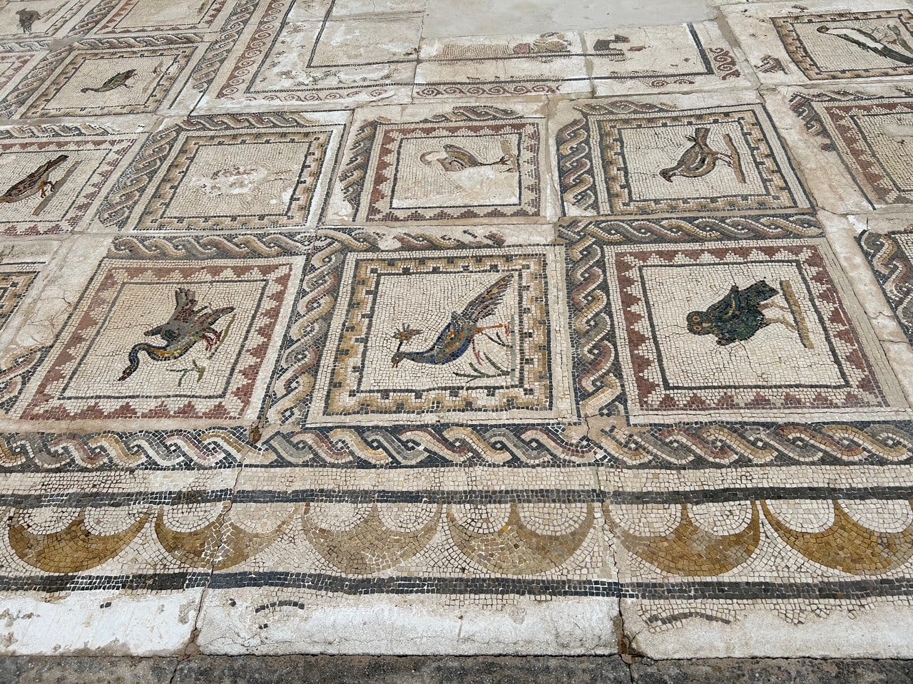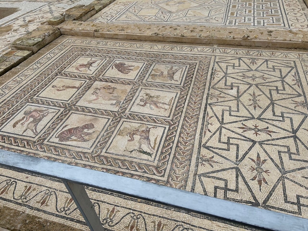 Only relatively recently (a few decades ago) were the ruins taken seriously, with archeological efforts to dig up the remains and reconstruct them. Much of it had been removed over the decades to decorate the homes of the rich, or provide building materials. But surprisingly, much remained. The mosaics I will show you are all original. Missing areas of the mosaics are left empty. They were used to decorate the floors of the rich homeowners.