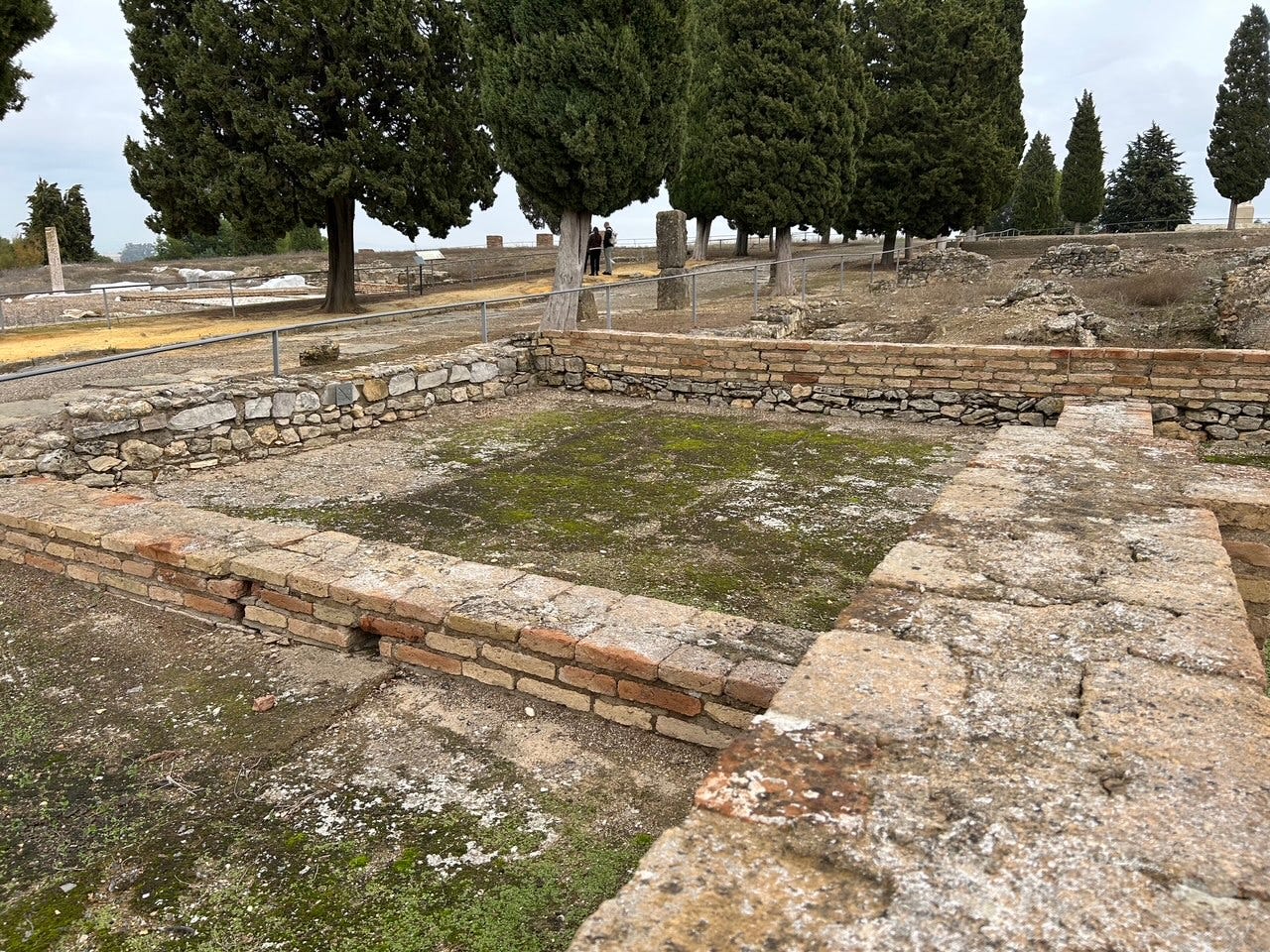 Italica is the first Roman city on the Iberian peninsula. You might recall that Hannibal of the Carthaginians crossed the Strait of Gibraltar with 80 elephants and an army and after crossing the Alps attacked Rome, about 220 BC. In those days you could sail up to Seville and Italica, now just outside the town of Santiponce, which is 6 miles away from Seville.
