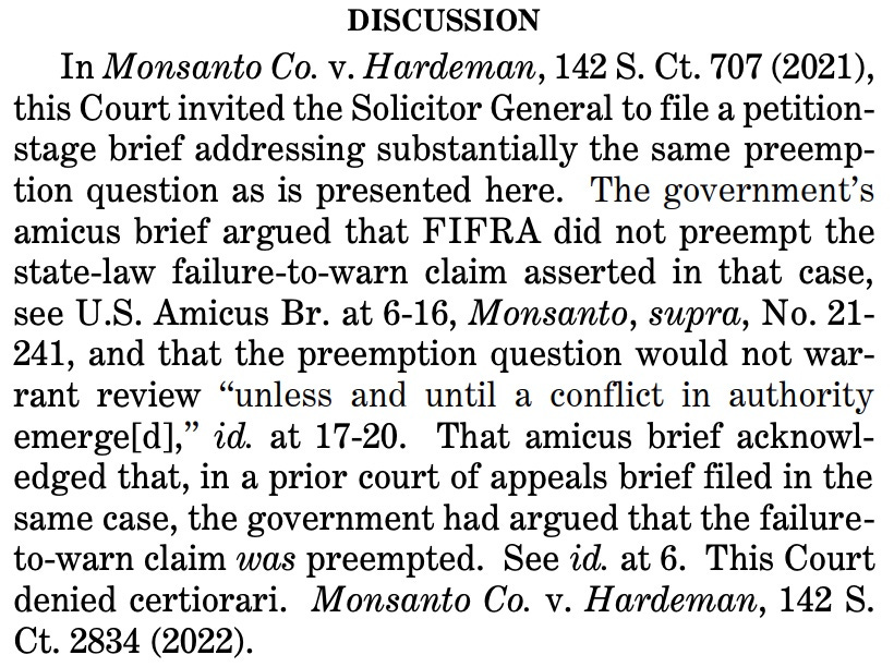About 3 years ago the Supreme Court chose not to take up a case like this one. However, now the Executive Branch is telling it not only to take up the case, but to rule in favor of Bayer and against the right of states to essentially challenge the validity of the warning labels approved by the (captured) EPA.