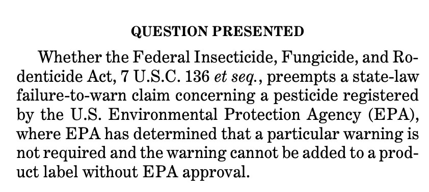 Here is the question that the DOJ amicus brief addresses. It could not be any clearer. Looming in the background is the sense that Bayer/Monsanto already owns the EPA, which will do what it wants in terms of whether to omit adding pesticide dangers to labels. So what Bayer/Monsanto needs to do is just makes the states 100% subservient to the EPA labels and BOOM, it wins. As do the hundreds of other pesticide companies.