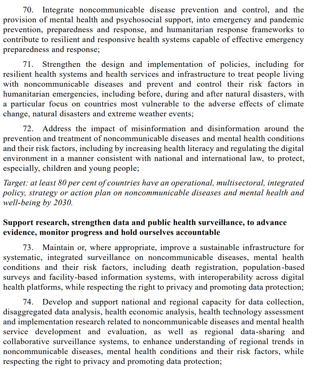 First, the document in no way positions non-communicable diseases and mental health as pillars to achieve sustainable development. Where did they get that idea? It just goes to show you how much meaningless blather there is in these type of documents.