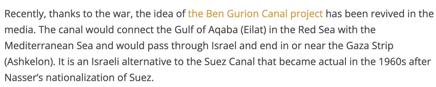 4. To potentially build another Suez Canal traversing or adjacent to Gaza. The canal plan below was developed long before the invasion of Gaza. The Ben Gurion Canal could be shorter if it went right through Gaza. Whereas if it traveled close to Gaza along the original trajectory, before October 7, it would have been susceptible to mortar attacks from Gaza. The Suez Canal generates $10 Billion in revenue yearly.