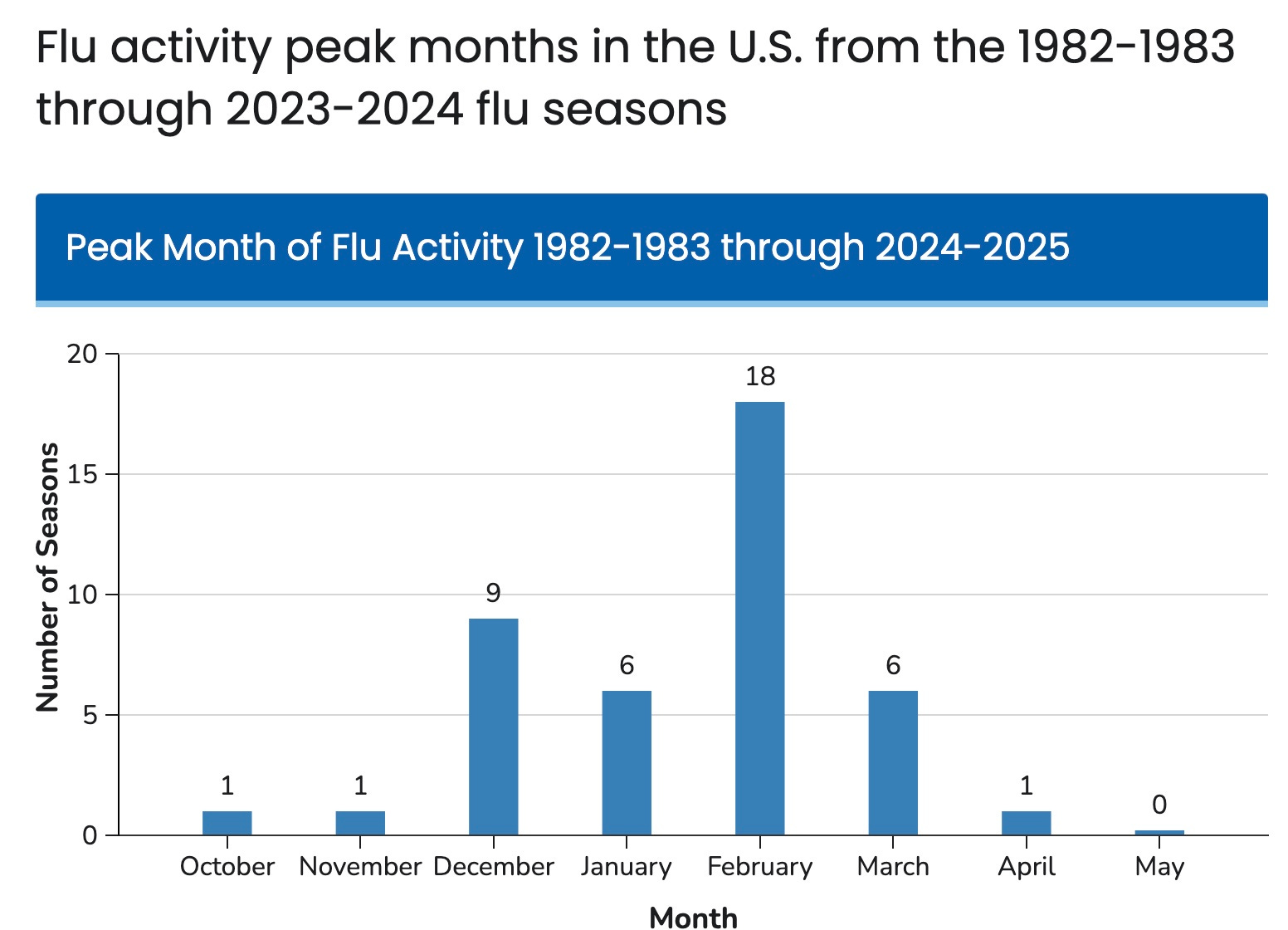 It is not unusual for flu seasons to start early, with the month of peak of flu activity each year since 1982 graphed by CDC. So this was not such a crazy early flu season, as also had been claimed.