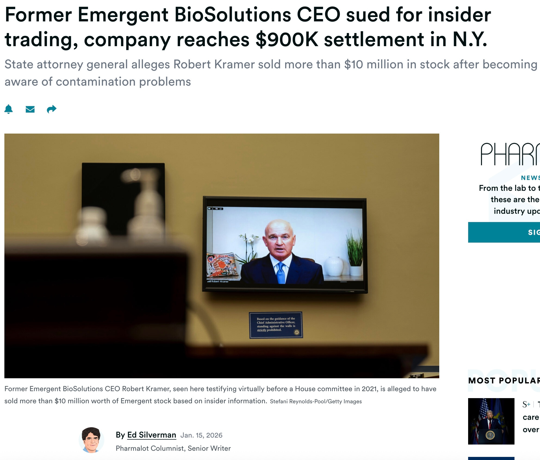Former Emergent BioSolutions CEO sued for insider trading, company reaches $900K settlement in N.Y.