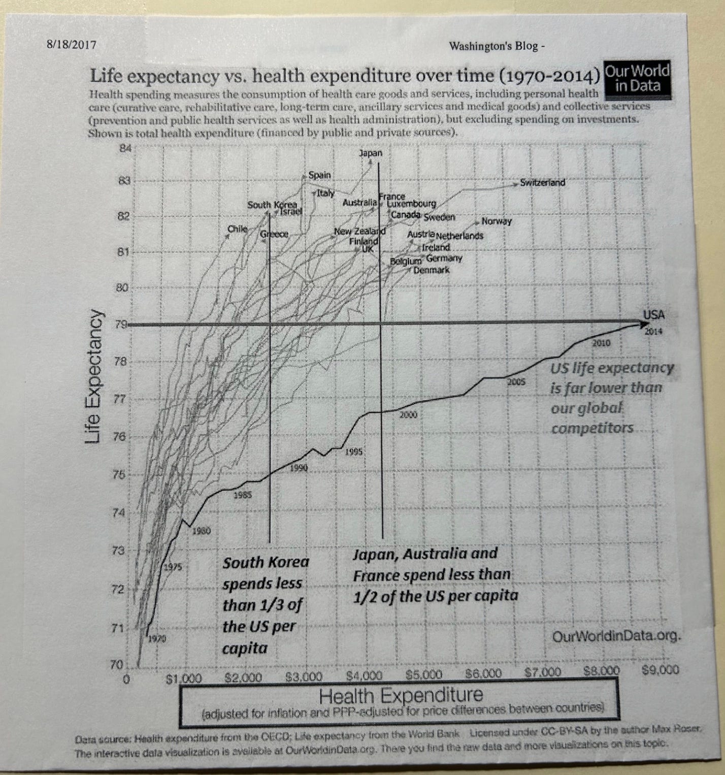 I love the way this graph was designed. Note how as US expenditures rose more rapidly than any other country represented, our increase in life expectancy rose more slowly—almost as if we were seeing an inverse relationship between increased spending and healthimprovements, when compared with other developed nations.