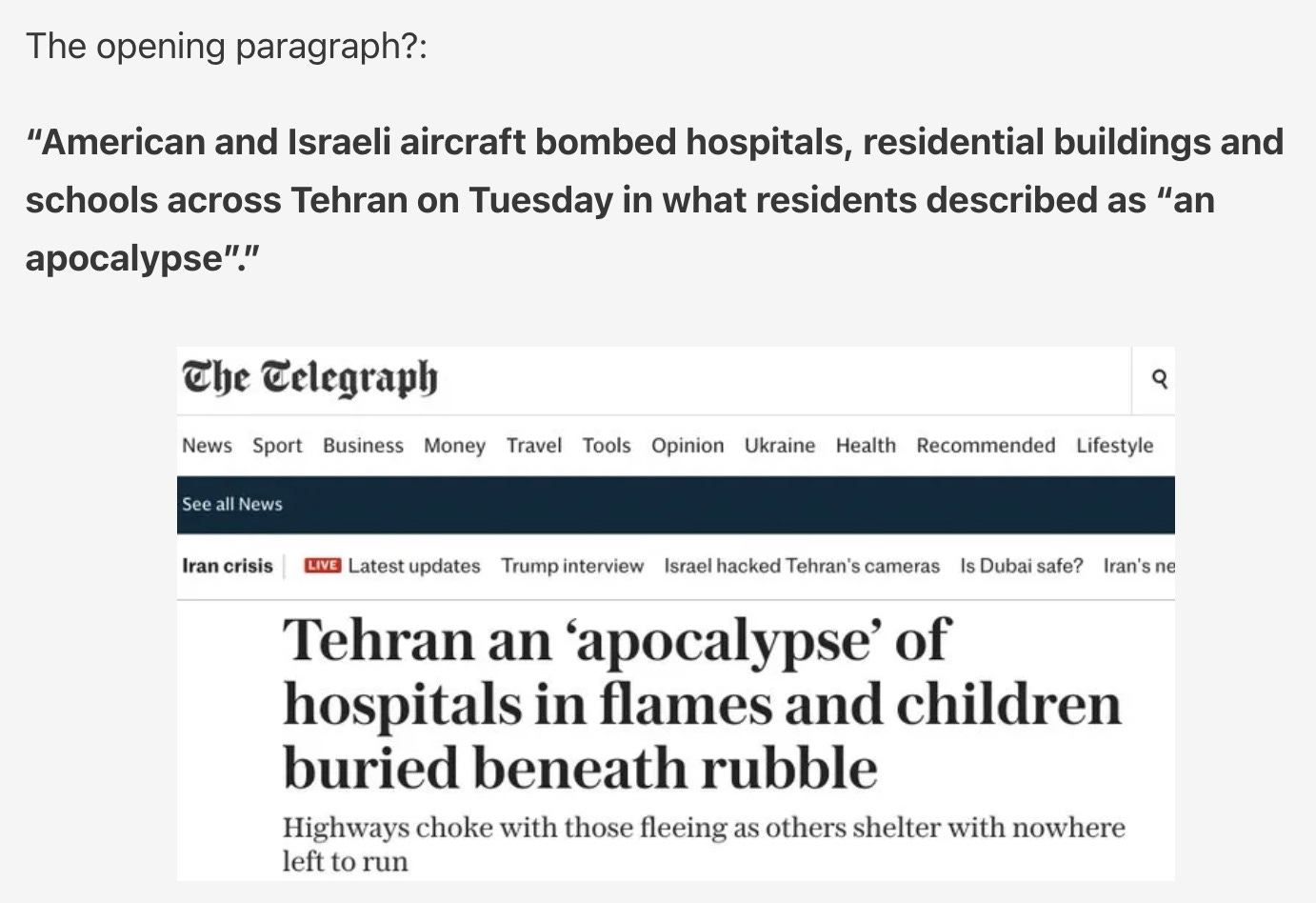 The conservative, high quality British newspaper, The Telegraph, told us the following today: