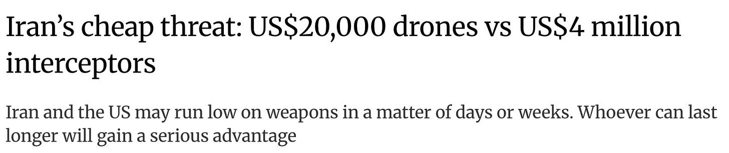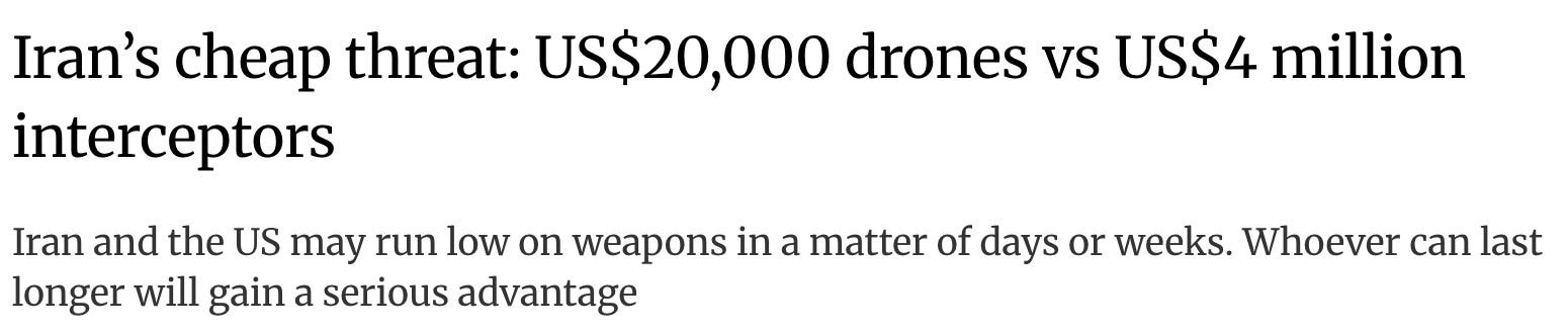 Which is what we have been hearing since the war started—that Iran has tens of thousands of drones and missiles, can produce them rapidly, and will send its most powerful weapons out once the PATRIOT and THAAD interceptors have been used up. We can make them slowly and the cost of each interceptor is enormous.