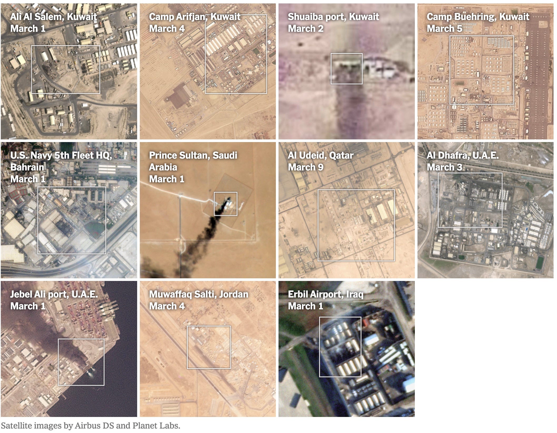 The New York Times has identified at least 17 damaged U.S. sites and other installations, several of which have been struck more than once since the war began. Our analysis is based on high-resolution, commercial satellite imagery, verified social media videos and statements by U.S. officials and Iranian state media.