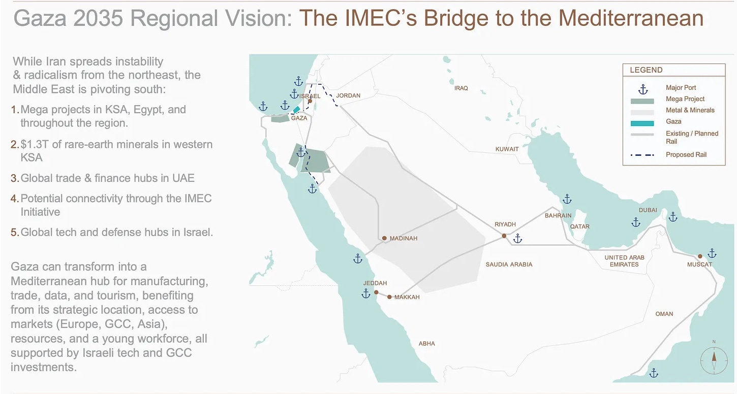 Gaza has been positioned for reconstruction on the Accords’ rails — the GREAT Trust slides109 position it as the Mediterranean terminus of IMEC, with data centres, a deep port, and high-speed rail connecting to the Gulf. Ukraine is being connected through EU membership….