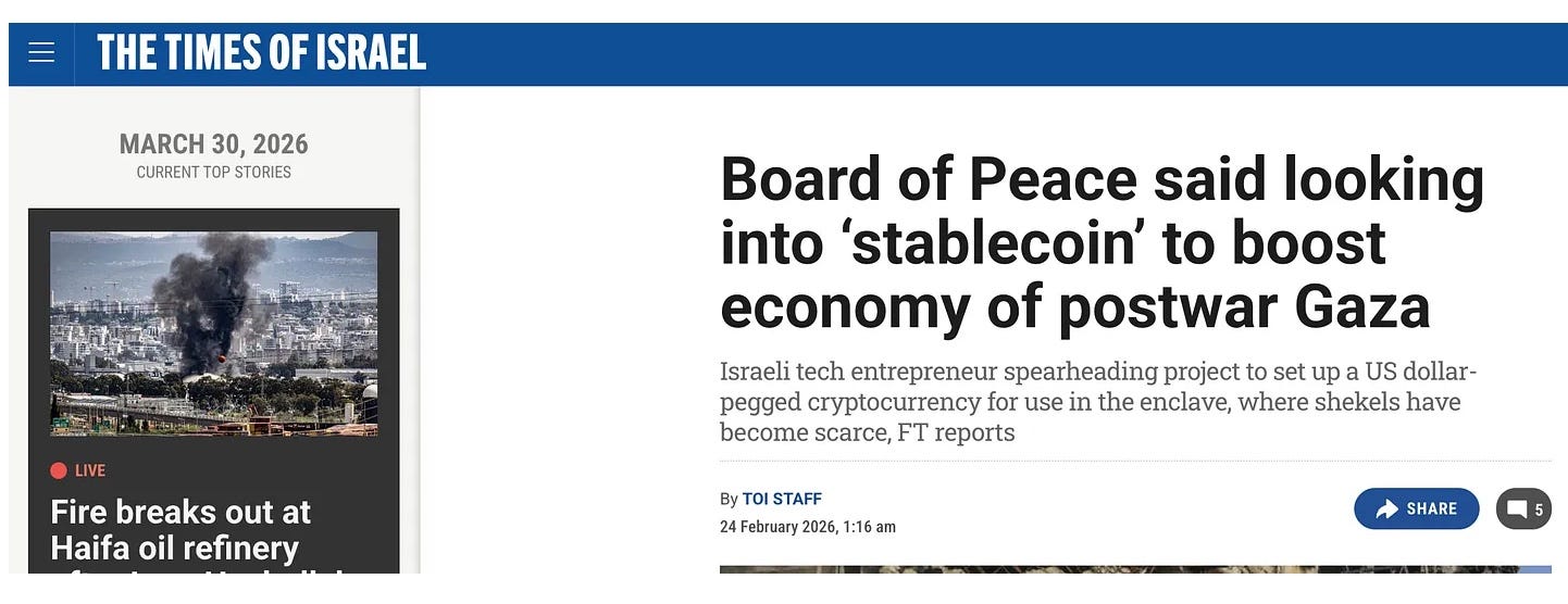 The BIS’s Project Mandala105 performs the identical function at the CBDC transaction level: encoding pre-existing rules into the payment itself, so that compliance is embedded before the money moves. Project Rosalind provides the retail enforcement layer — programmable money where conditions are attached at the point of sale. Gaza’s stablecoin and digital wallet system is this architecture deployed in a conflict zone….