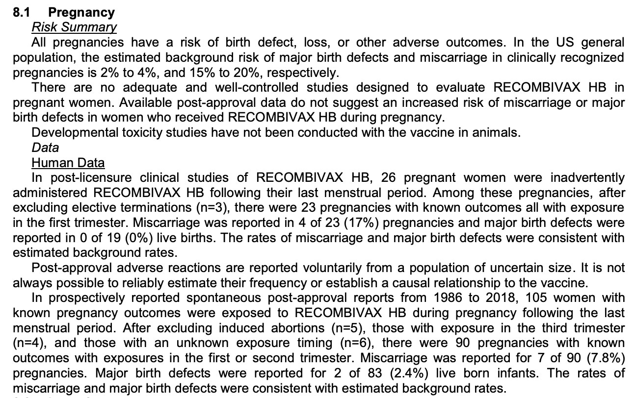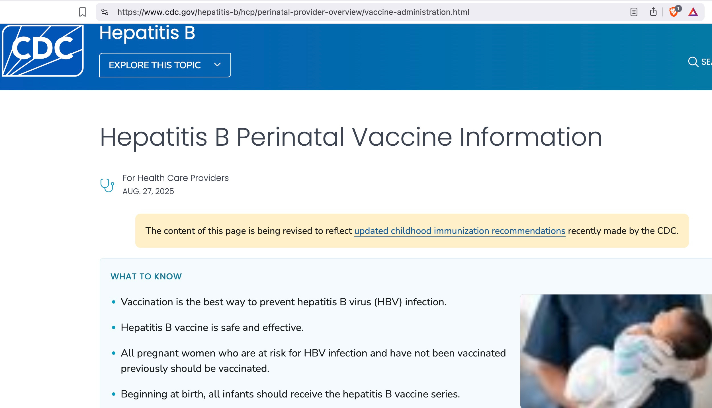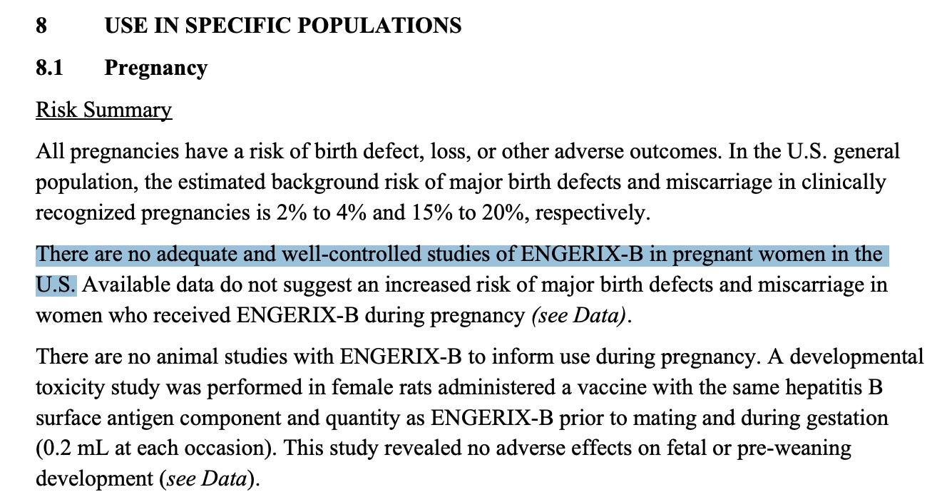 The CDC recommends not only a Hepatitis B vaccine at birth for all newborns at no risk, but also for their mothers during the pregnancy if unvaxxed–double dosing the babies!–no risk assessment!