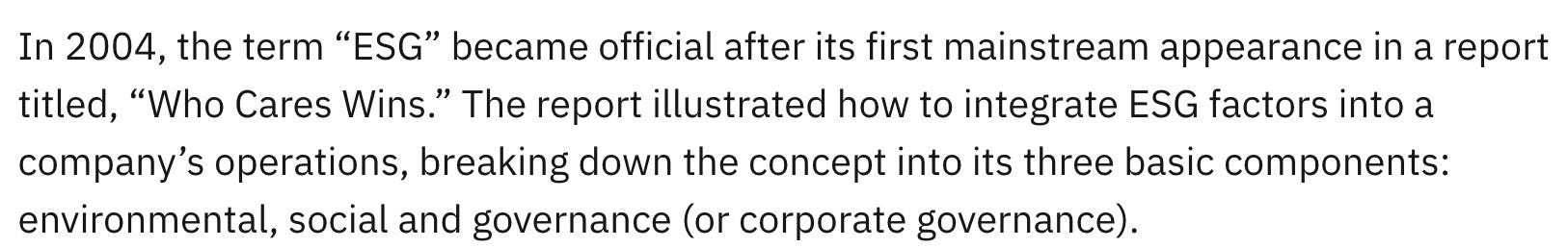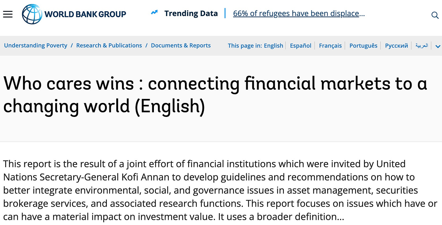 “Who Cares Wins” was a 2017 United Nations publication with the World Bank. It is they who created the ESG terminology, and originated (or were probably given) the remit to attach conditions to the ability to obtain finance for businesses—and pushed it out to the world.
