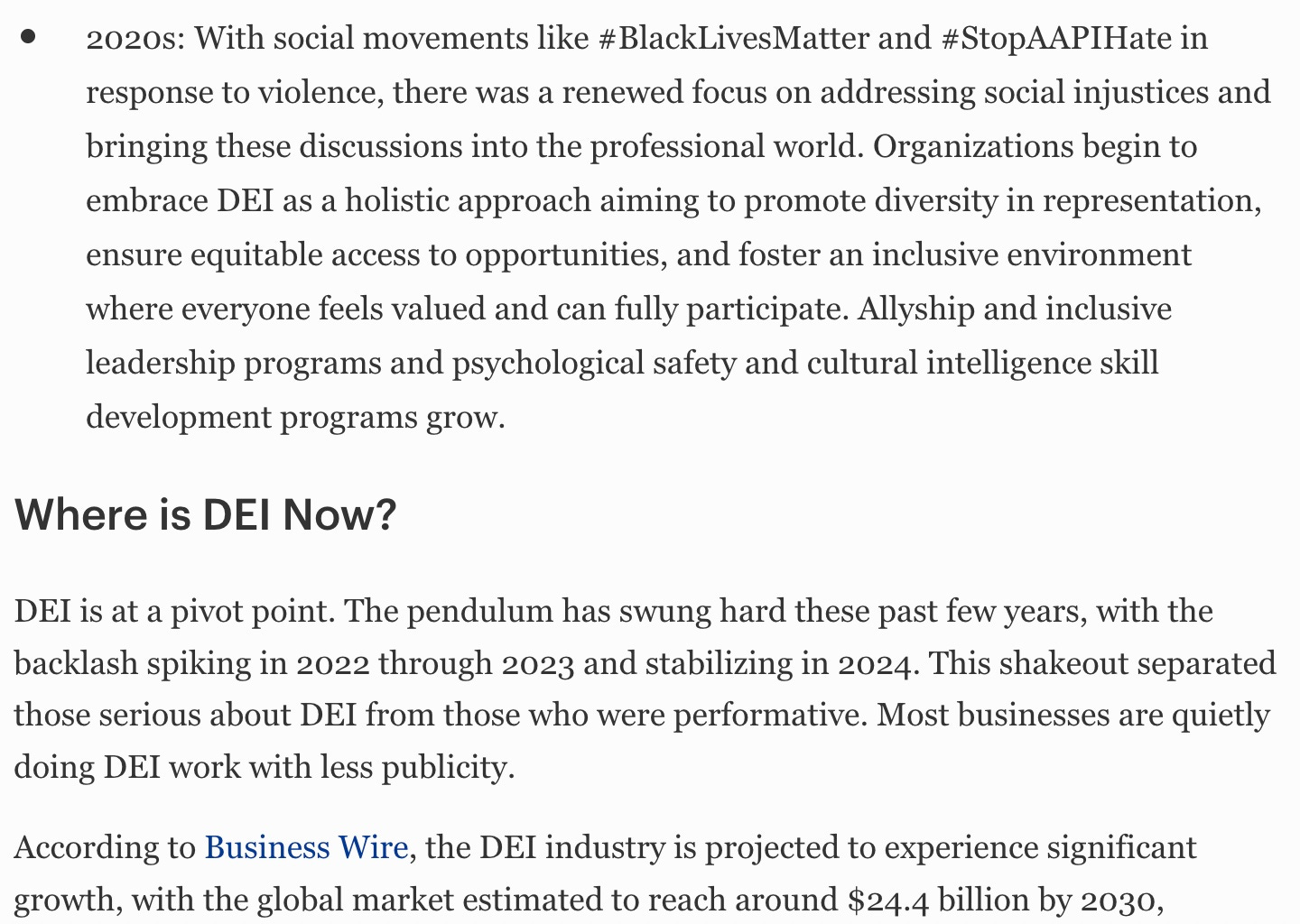 DEI is at a pivot point. The pendulum has swung hard these past few years, with the backlash spiking in 2022 through 2023 and stabilizing in 2024. This shakeout separated those serious about DEI from those who were performative. Most businesses are quietly doing DEI work with less publicity.
