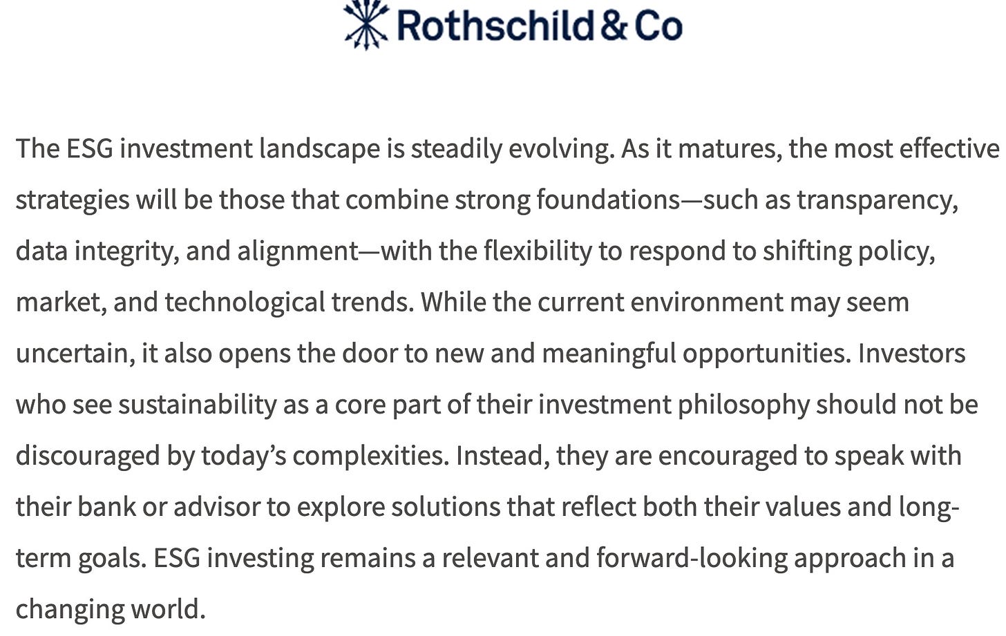 The Rothschild bank was also a big ESG supporter, even in June 2025, after a large outvlow in ESG funds that followed the inauguration of President Trump. Of course, we all want fairness in hiring, and for companies to take their social and environmental role seriously. The problem with ESG ratings is that they could easily be gamed. Thereby they assisted large companies to consume smaller ones that lacked the staff to creatively fudge the data they provided, and were thus being denied business loans.