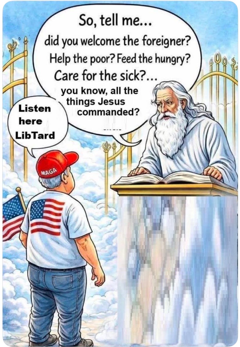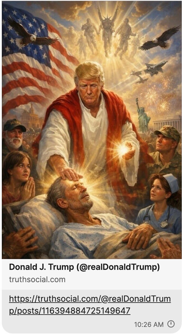 Below, Trump as healer Jesus seems to have called in an army containing either demons or angels plus a plethora of weapons. Duh?