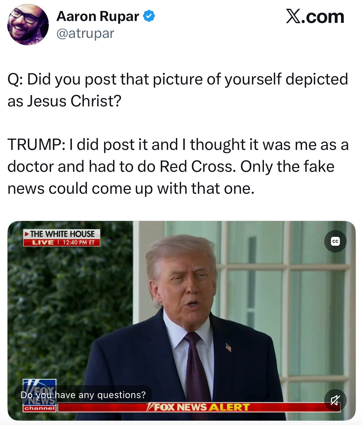 While receiving a McDonald’s food delivery to the Oval Office, the president told reporters that he posted a photo that depicted him as a robed, Jesus-like figure because he thought it had depicted him as a physician.