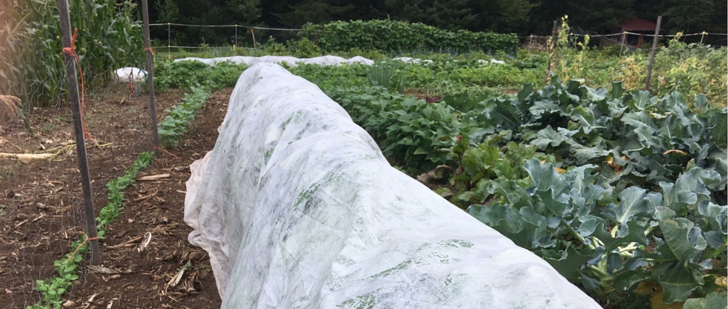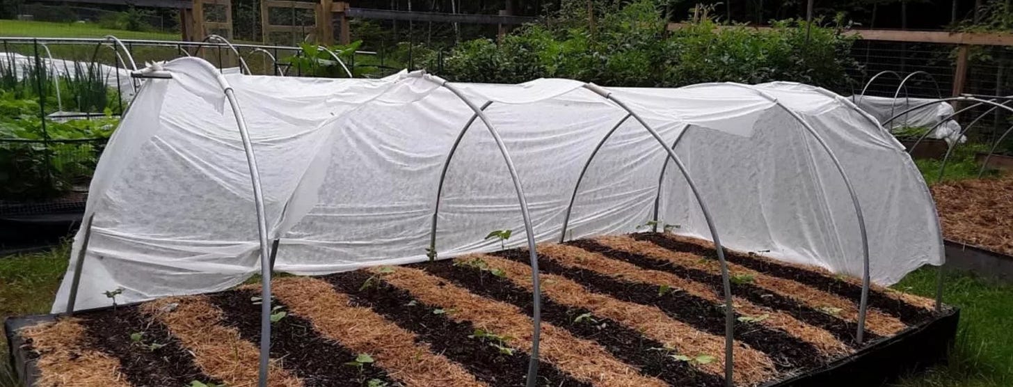 And keeping the young plants inside tents made of row cover keeps out the bugs and lets in as much sun as you wish–the row cover comes in different weights that allow in different amounts of sun. It can be reused year after year. I bought short lengths of rebar, stuck them in the soil, then threaded plastic tubing from Home Depot over the rebar to create cheap hoops, and attached the row cover to it with clothespins. Very quick and easy to adjust or take on and off.