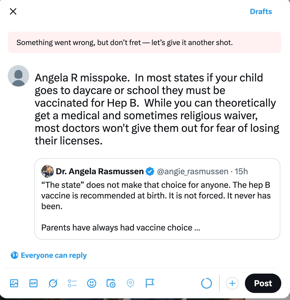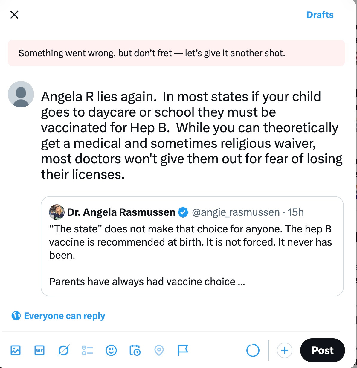I never get more than 100 views on my twitter posts any more, when I am even allowed to post something original. Yesterday and today I tried to correct Angela Rasmussen’s BS about Hepatitis B vaccine mandates for children, but it would not let me. Who is Angela Rasmussen? Who is TWITTER/X protecting?