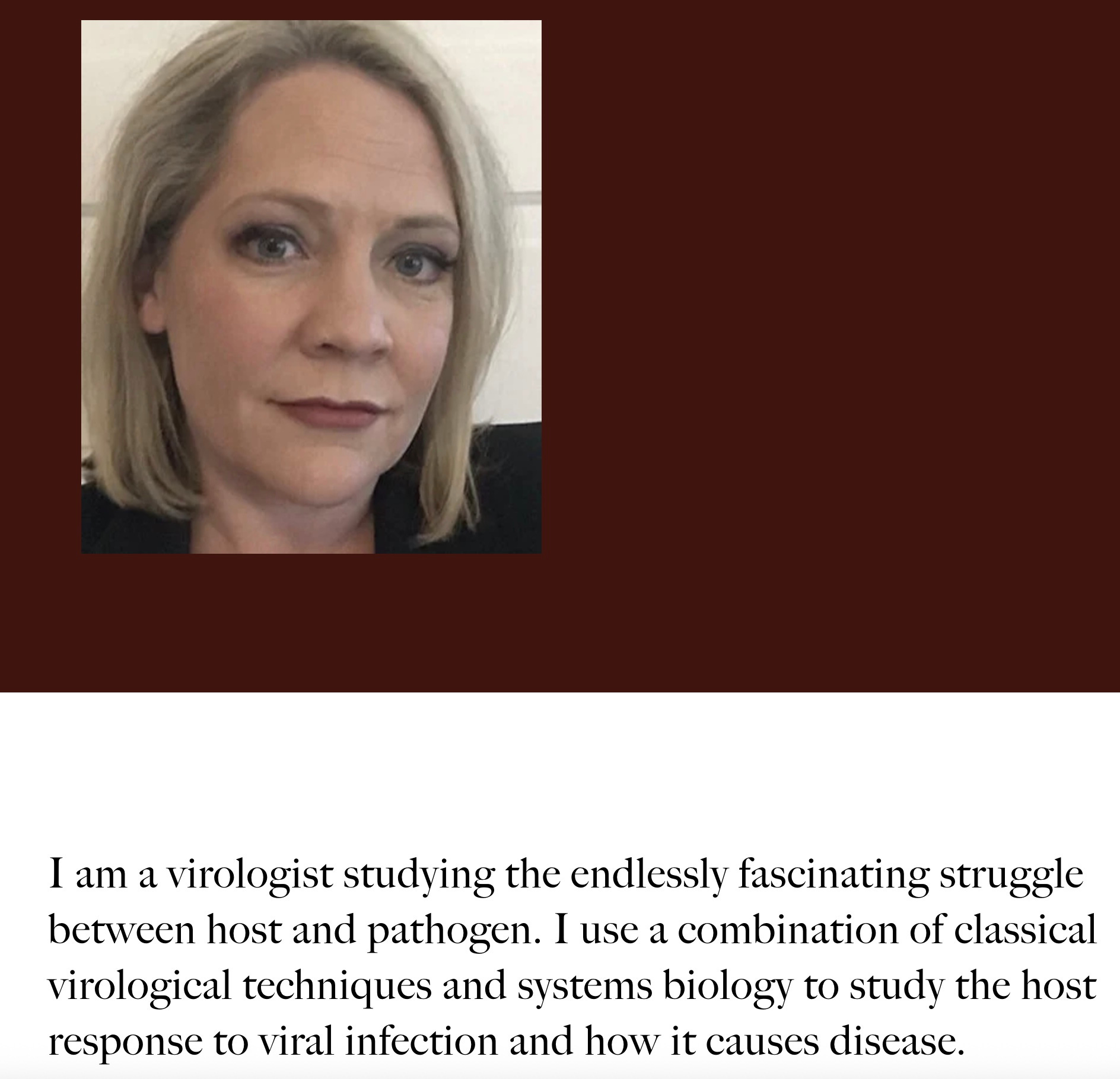 If she actually works on viral mechanisms, as her website claims below, she does not publish any papers about the research. And she tends to be way down the massive authorship list of these papers.