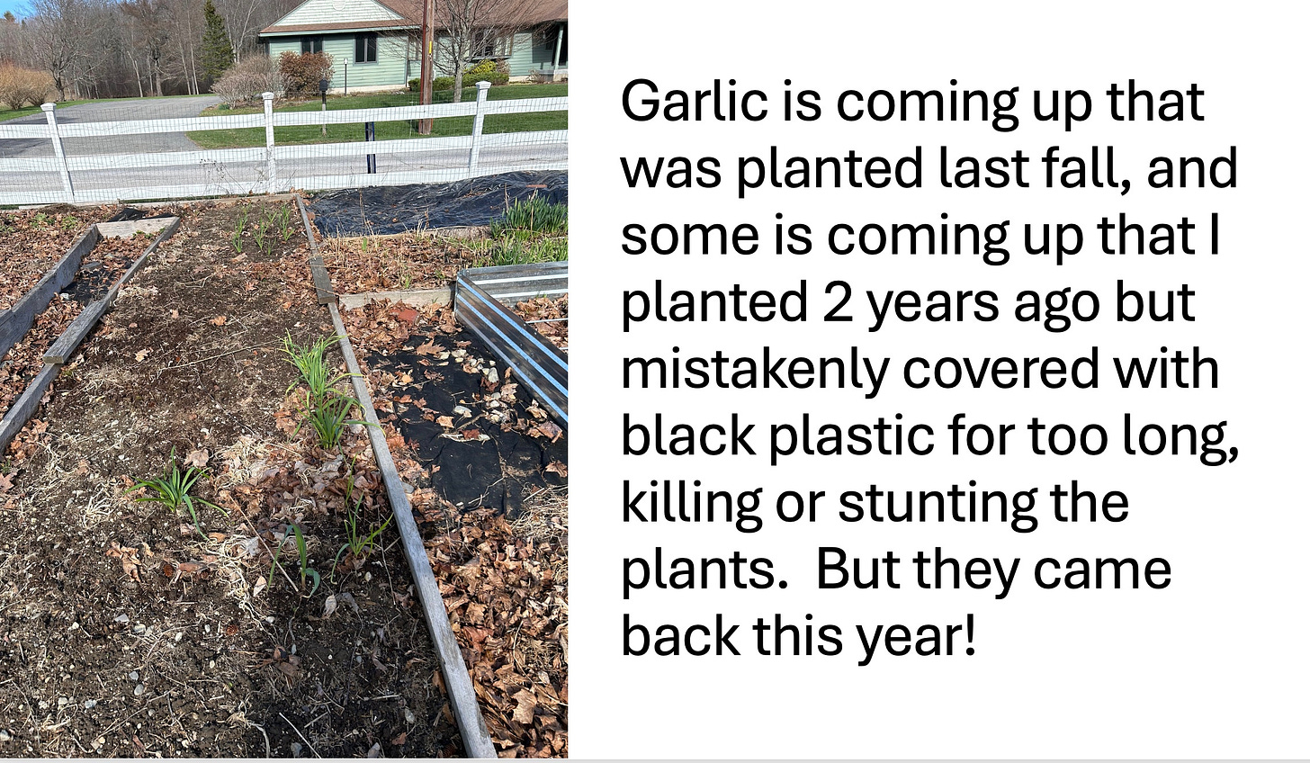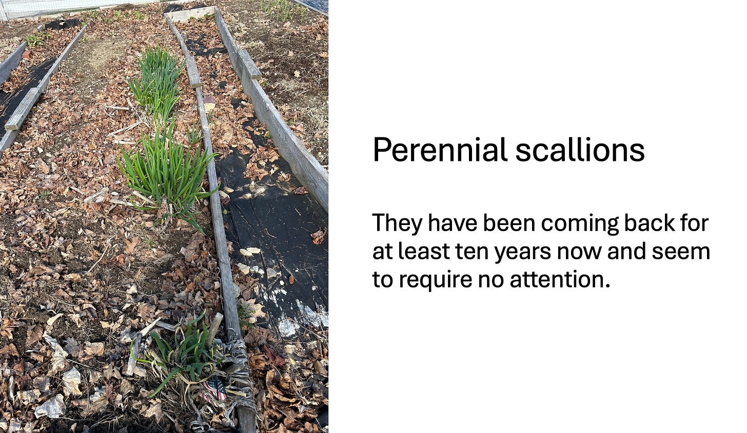 These scallions also keep coming back, and stay kinda green all winter—you can pick them for cooking April through November or December—until the snow covers them. I just add my homegrown potting mix to the raised beds, because the beds shrink as they yield up their nutrients to the plants each year, and need to be topped up.