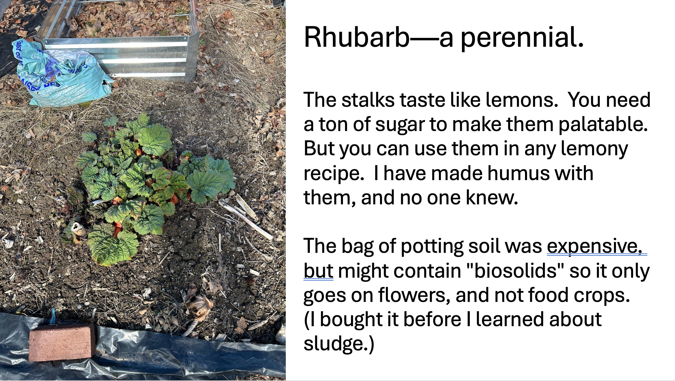 Rhubarb is what every New England gardener has. I don’t eat much cause it requires too much sugar to be edible, yet the plant keeps growing bigger each year though I have given it absolutely nothing to help it along.