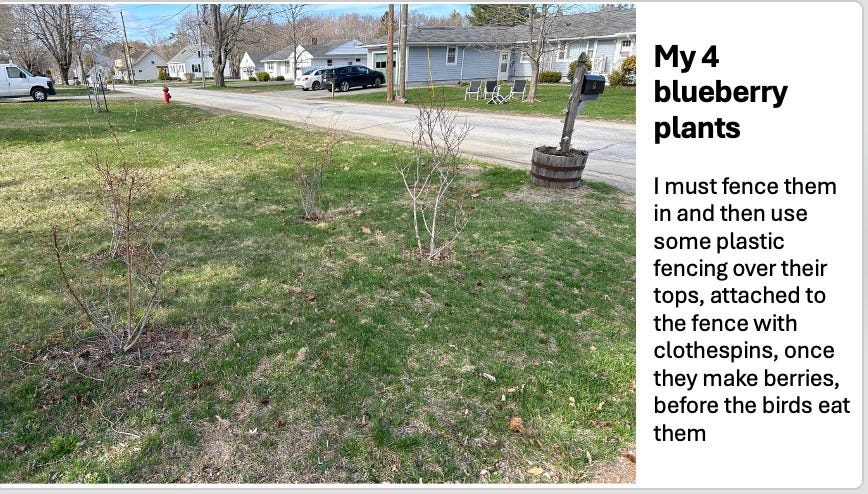 The 4 blueberries are planted on the other side of the driveway. I finally realized they needed serious bird proofing if I was to get a decent harvest, and not use something birds could poke their beaks through. So I bought a 4 or 5’ tall tightly woven metal fence and cut it up to make a good circumference around each bush. You tie the ends together with bits of wire or even twisty ties. Then I cut circular pieces of my old plastic fencing to be attached to each fence, like a chef’s cap, leaving sufficient room for the bushes to grow. You want the bugs to get in to pollinate, but I want the birds eating my ornamental berries, not the blueberries.