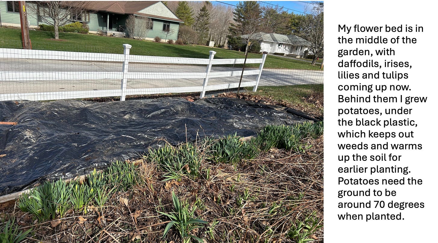 I bought 3 types of northern potatoes the first year I planted them, 2 lbs each. I had never known that potatoes could be determinate or indeterminate and what that meant. But when it came time to “hill” the potatoes, I didn’t want to. Finally I hilled them with a mix of straw and dirt.